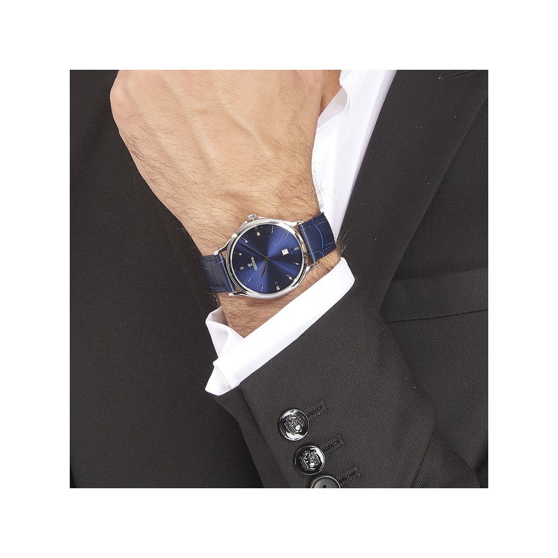 Elle séduit de par sa couleur bleue. Le cadran assorti souligne la présence d’un dateur. Les index en bâtonnets complètent son charme.